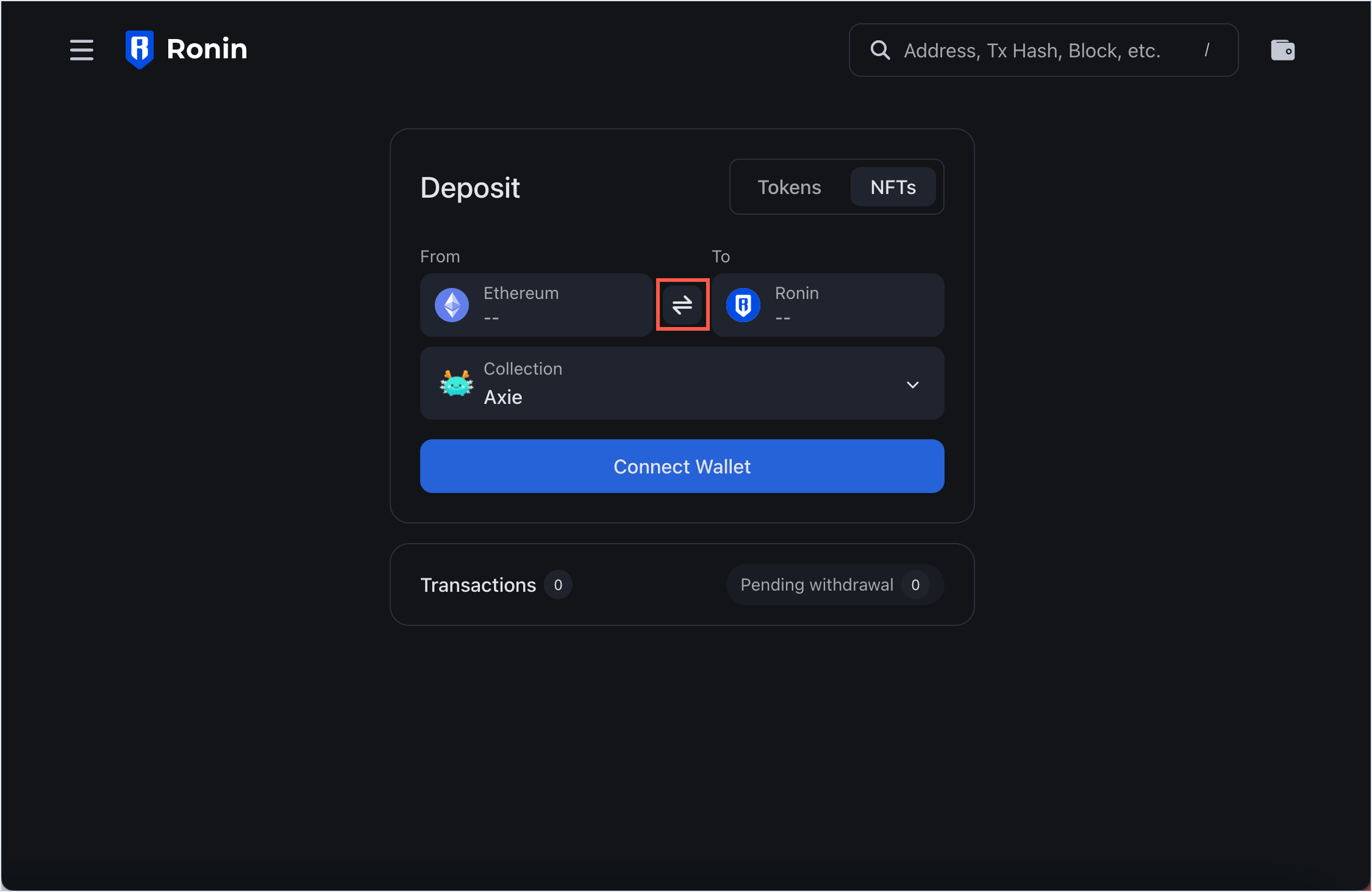 - Open Ronin Bridge and select the NFTs tab.